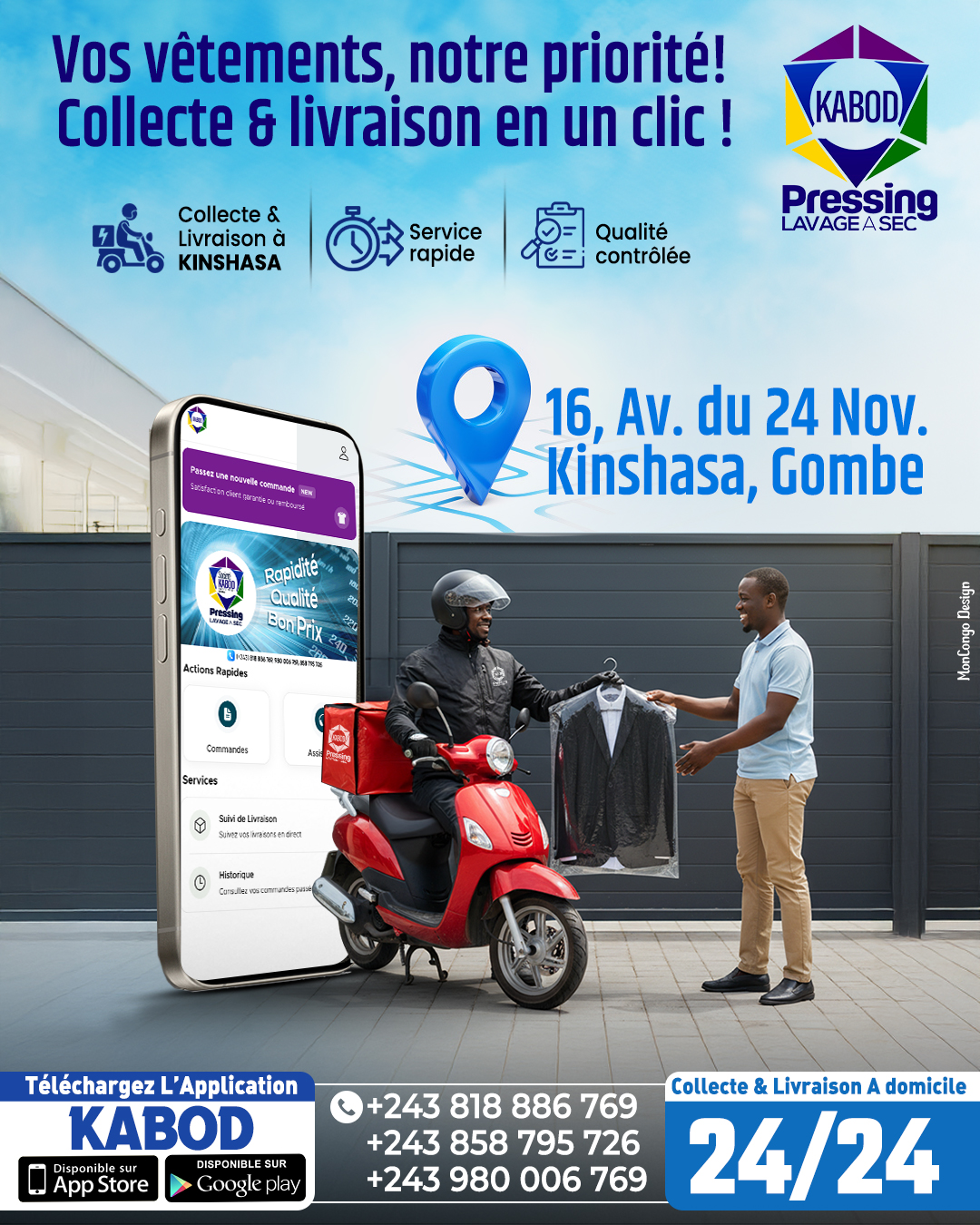 KABOD PRESSING est une société qui œvre dans la blanchisserie et utilise une application mobile pour la collecte et la livraison partout dans la ville de Kinshasa gratuitement!
