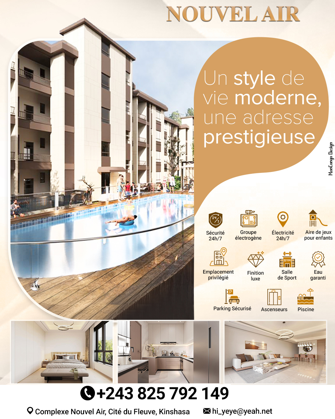 À NOUVEL AIR, chaque instant devient un moment de prestige, avec une vue imprenable sur le fleuve et un cadre de vie incomparable au cœur de Kinshasa.