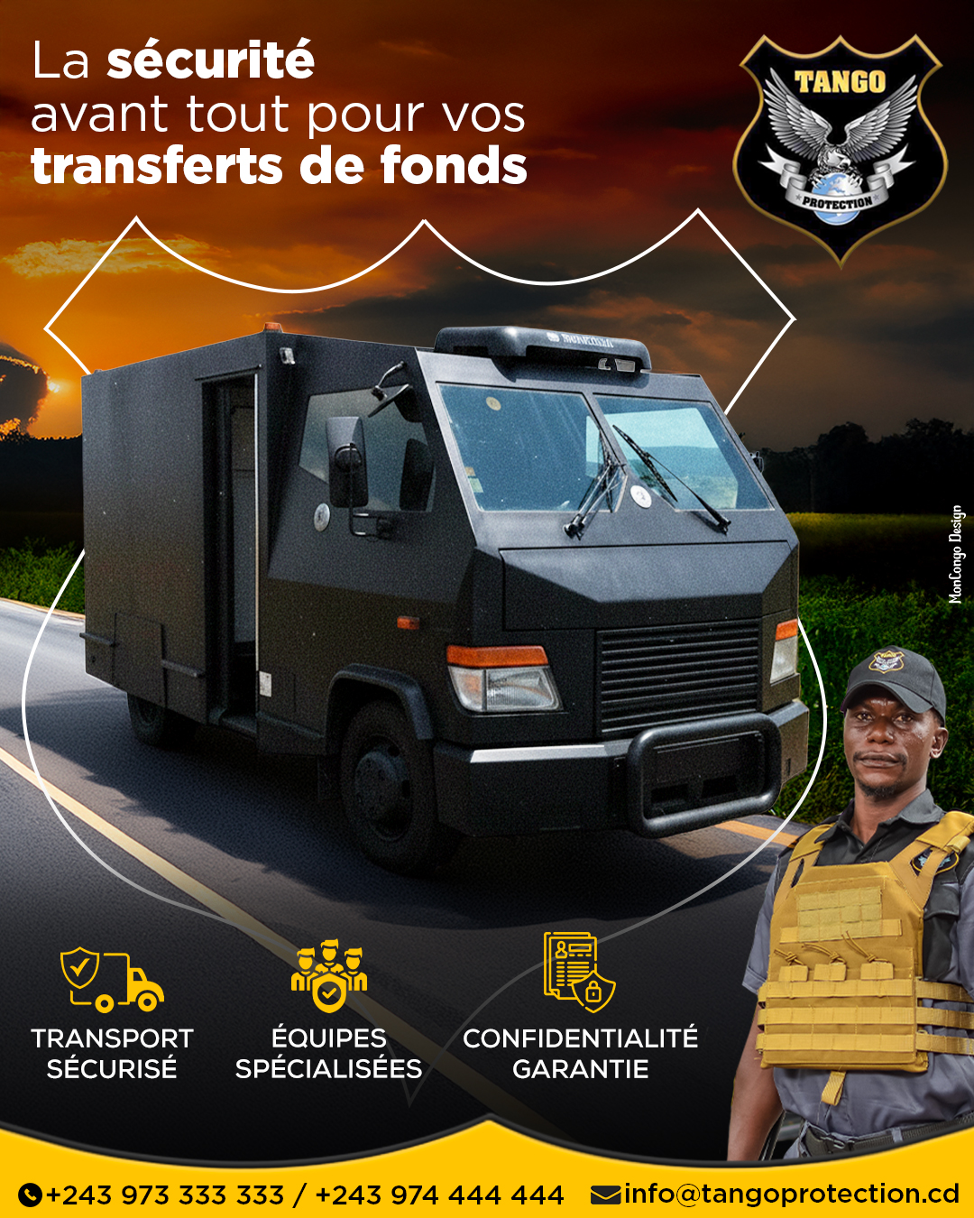 Tango Protection est un acteur majeur de la sécurité en République Démocratique du Congo liée à la confiance que nous accordent nos clients sur toute la capitale. Actuellement, nous sommes en mesure de réaliser des prestations de haut niveau (qualité et volume) par des contrats engagés. Divers acteurs économiques, dont essentiellement l’industrie, font appel à nos services pour contrôler leurs sites de production et assurer la sécurité du transport de leurs marchandises, comme de garantir l’intégrité physique de leur personne.