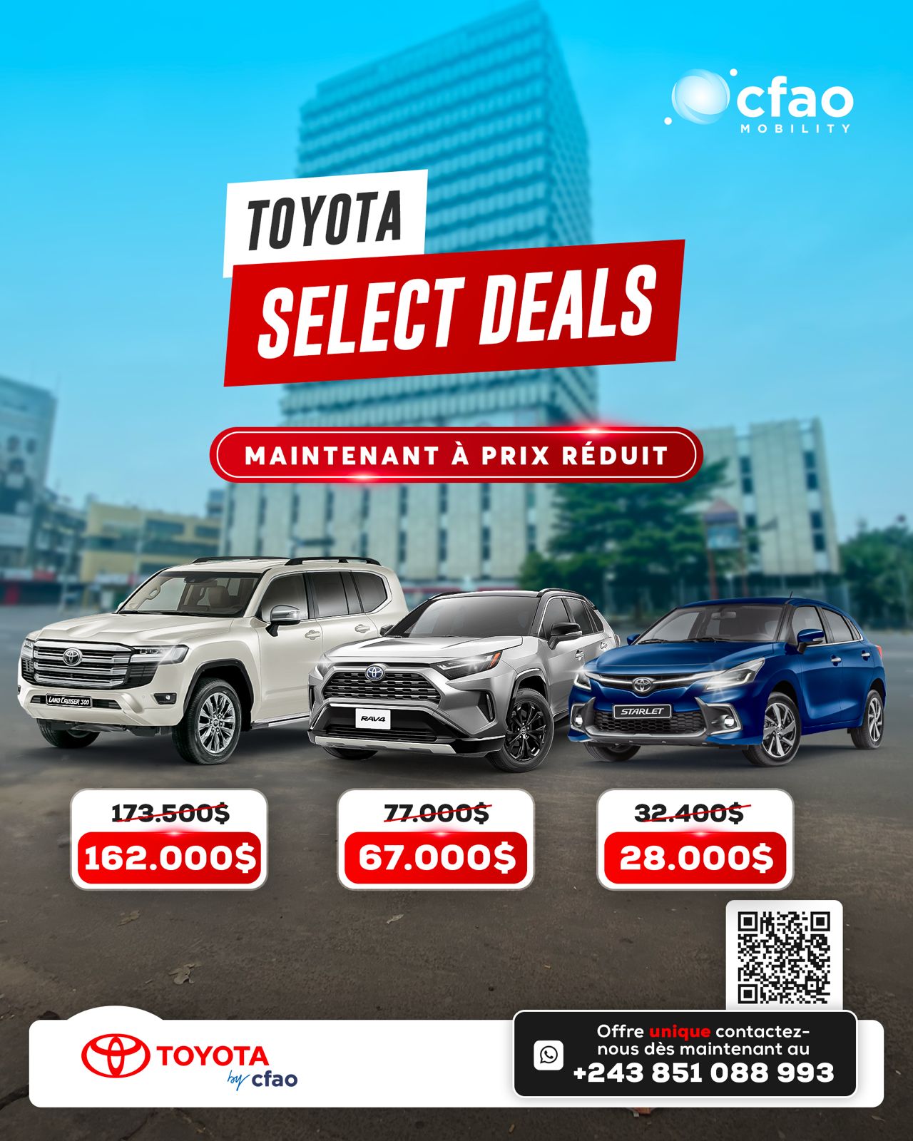 Installé en République Démocratique du Congo depuis 2001, CFAO Motors RDC est le distributeur exclusif de six marques de renommée mondiale. Il vend une large gamme de véhicules neufs de tourisme, 4X4 et utilitaires sous les marques Toyota, Peugeot et Suzuki, ainsi qu'une gamme de deux roues et quads sous la marque SYM.