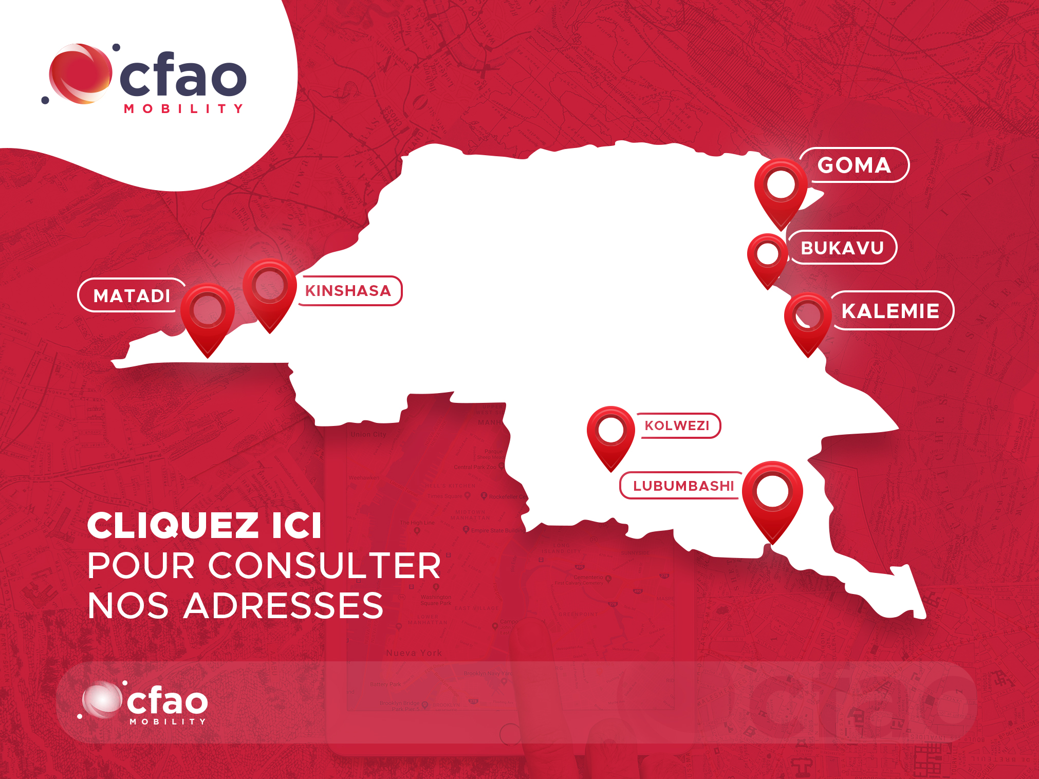CFAO Motors RDC dispose sur le territoire d’implantations à Kinshasa et Lubumbashi ainsi que d’un agent à GOMA. Avec ses 3 points de vente, CFAO Motors RDC assure à ses clients plus de réactivité et de disponibilité.