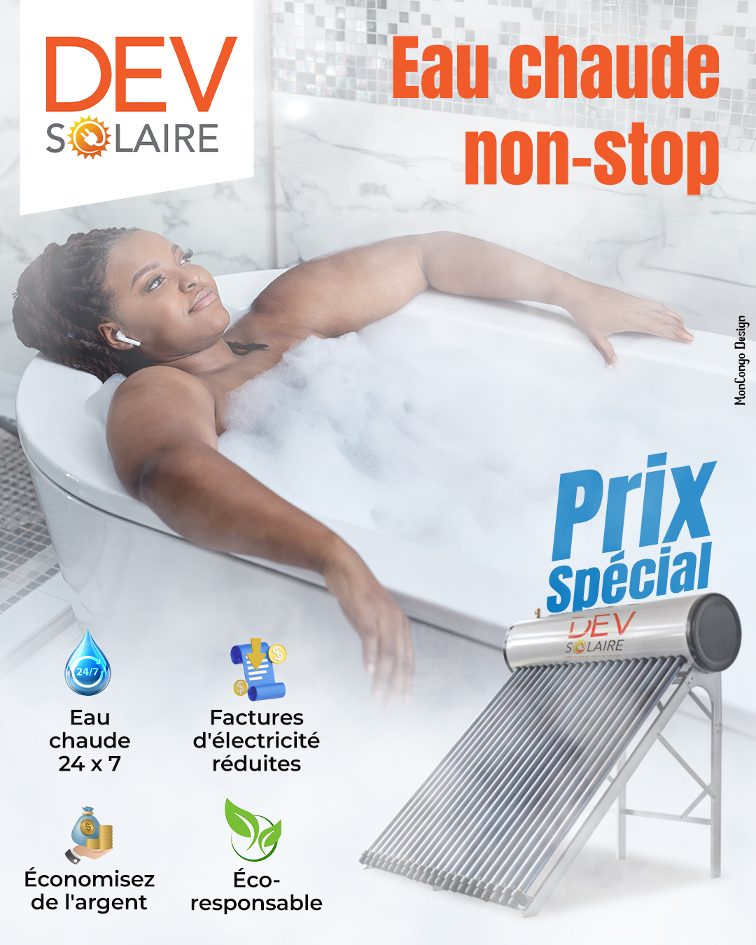 DEV SOLAIRE intervient dans les énergies renouvelables et l'efficacité énergétique à travers la vente, l'installation, la maintenance, le service après-vente (réparation, entretien, dépannage) des équipements solaires, mais aussi dans la vente des appareils électroniques et électro-ménagers solaires à savoir : la climatisation solaire, l'hydrauliques (pompe immergée) solaires, caméra de surveillance solaire, télévision solaire, ventilateur solaire, lampadaire solaire pour éclairage public, des ampoules économiques solaires, fer à repasser solaire, réchaud solaire, friteuse solaire, congélateur et Frigo solaire, Power Bank solaire et bien plus encore.
