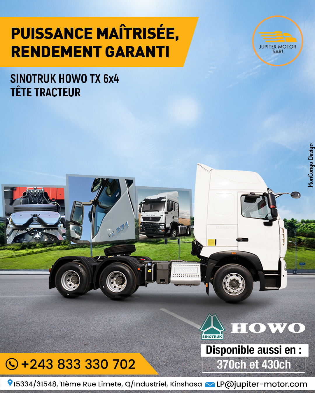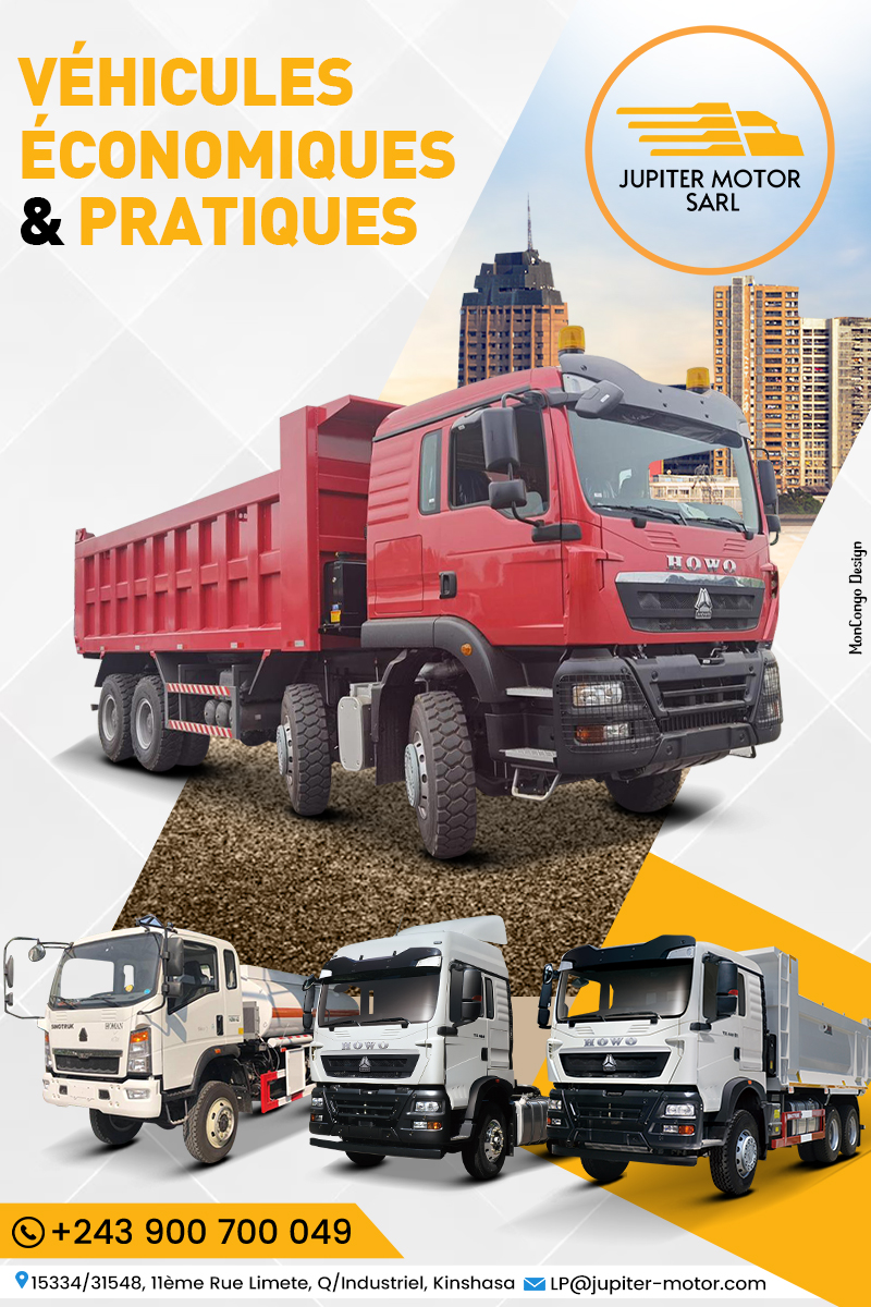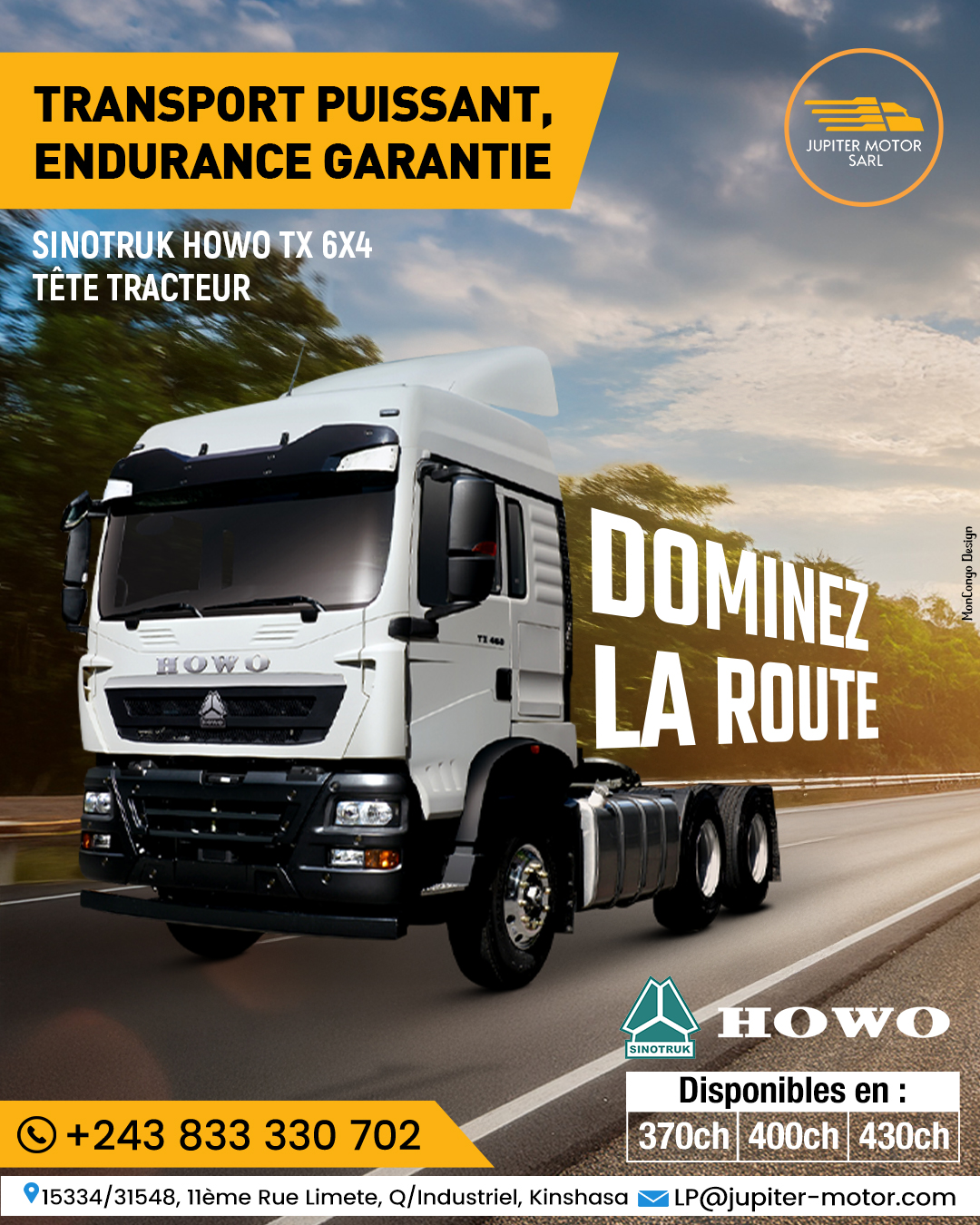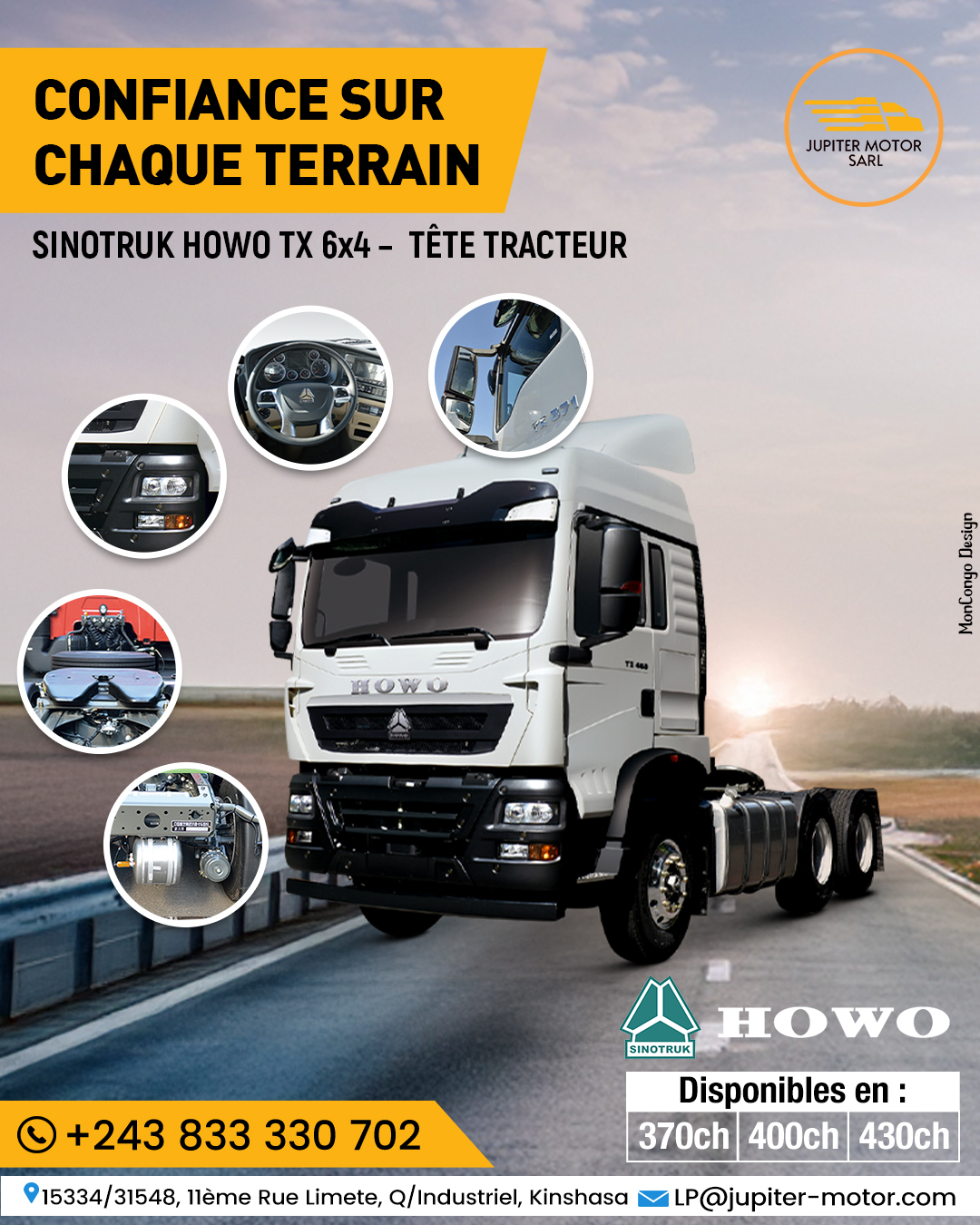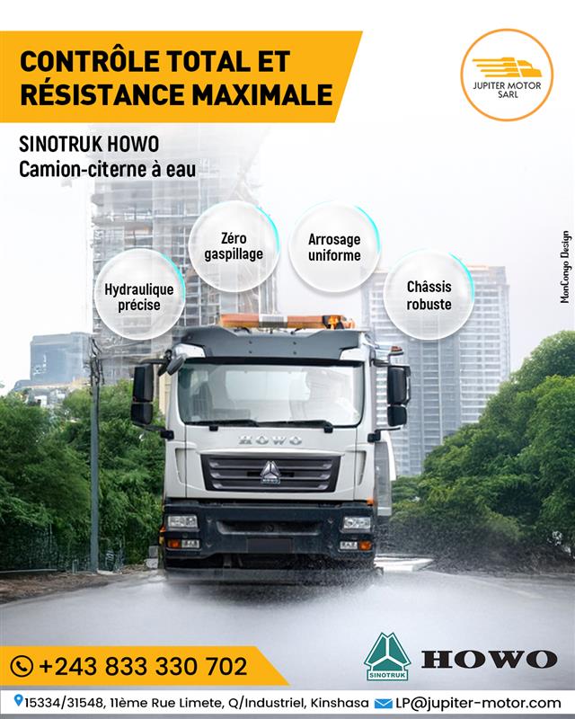 Pour répondre aux exigences uniques de nos clients, nous permettons la personnalisation des modèles Howo avec des spécifications sur mesure, directement depuis l’usine. Avec une présence dans trois villes clés — Kinshasa, Lubumbashi et Kolwezi — Jupiter Motor SARL est votre partenaire de confiance pour des solutions complètes et adaptées en véhicules poids lourds.