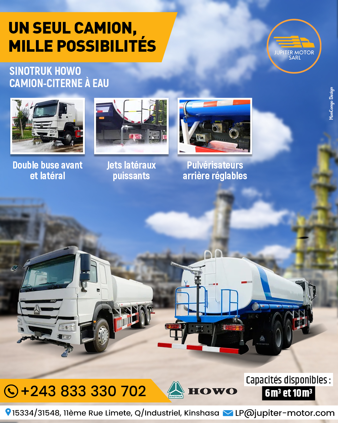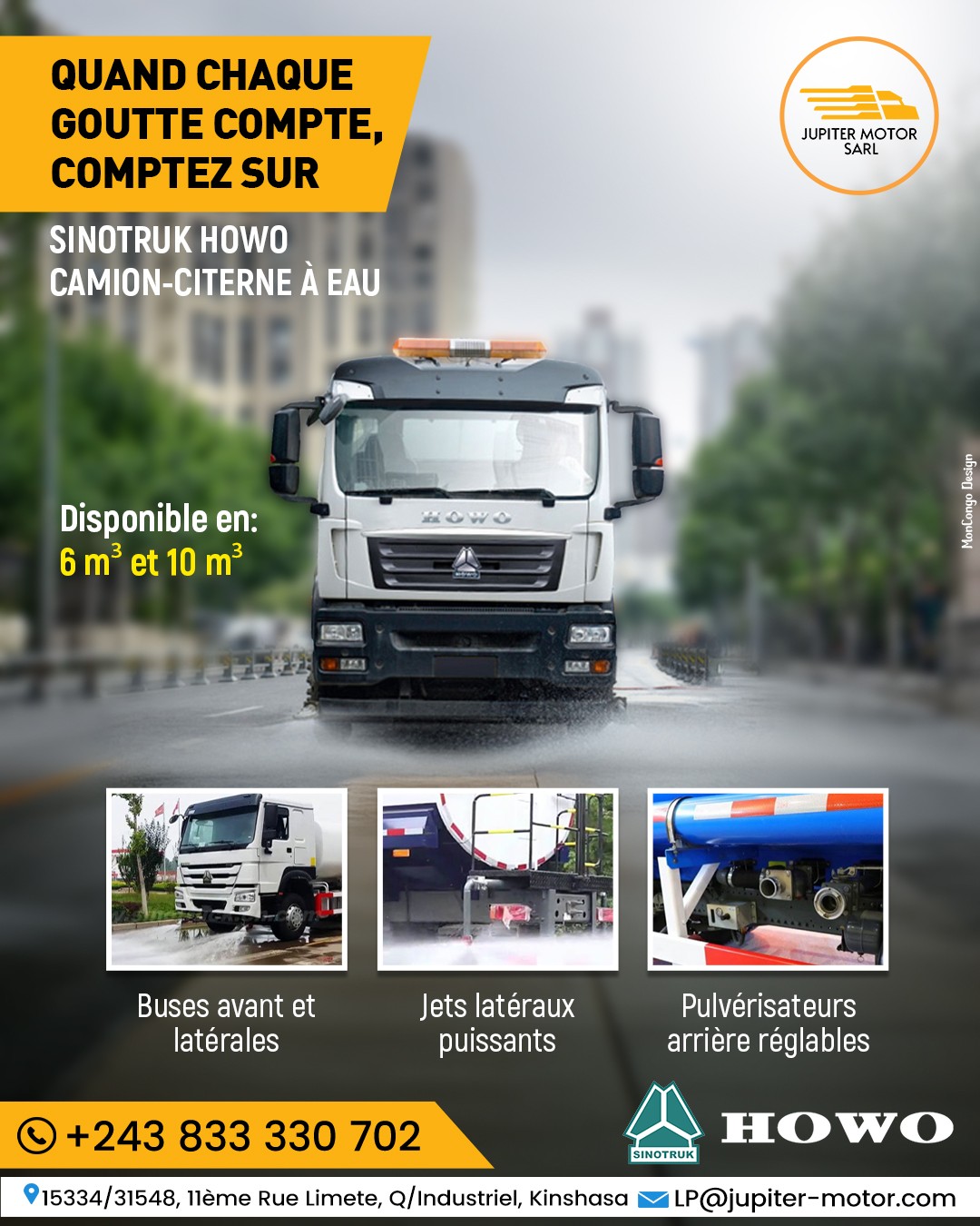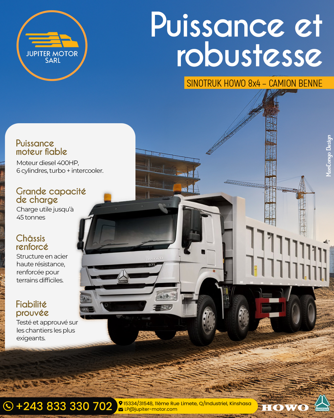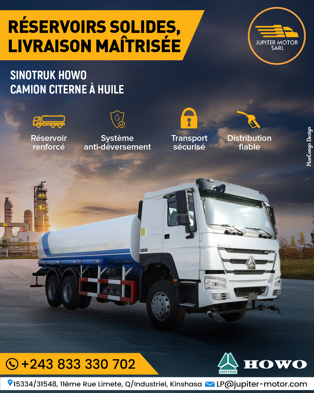 Pour répondre aux exigences uniques de nos clients, nous permettons la personnalisation des modèles Howo avec des spécifications sur mesure, directement depuis l’usine. Avec une présence dans trois villes clés — Kinshasa, Lubumbashi et Kolwezi — Jupiter Motor SARL est votre partenaire de confiance pour des solutions complètes et adaptées en véhicules poids lourds.