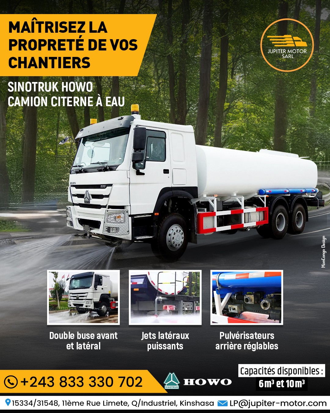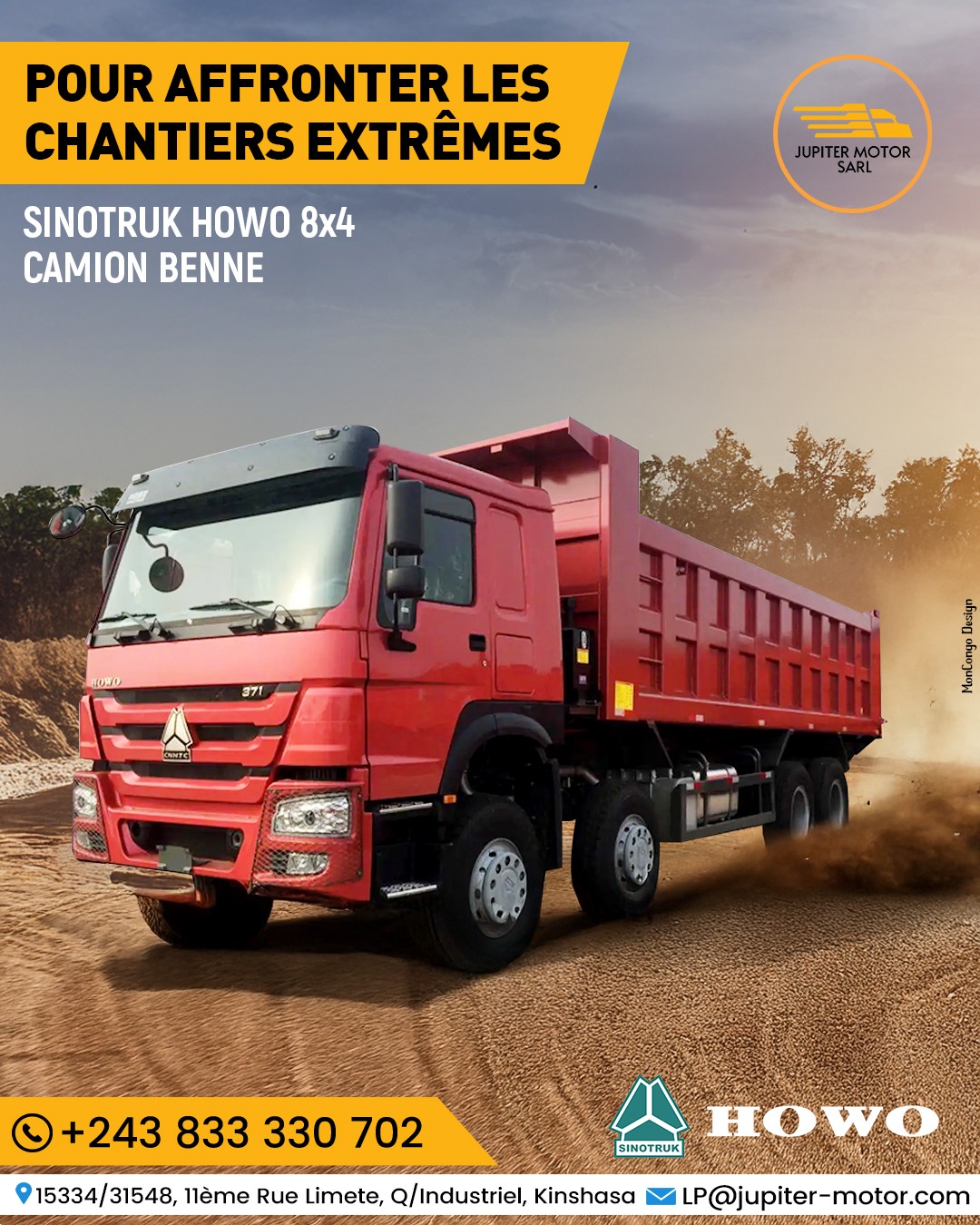Distributeur agréé de Sinotruk Howo en République Démocratique du Congo, Jupiter Motor SARL est votre guichet unique pour tous vos besoins en camions industriels Howo. Nous proposons une gamme complète de poids lourds, notamment des bennes 6x4 et 8x4, ainsi que des tracteurs routiers 6x4 et 4x2. En plus, nous offrons des véhicules à applications spécifiques tels que des camions-citernes pour carburant, des arroseuses d’eau, des camions-grues, des camions de pompiers, et bien plus.