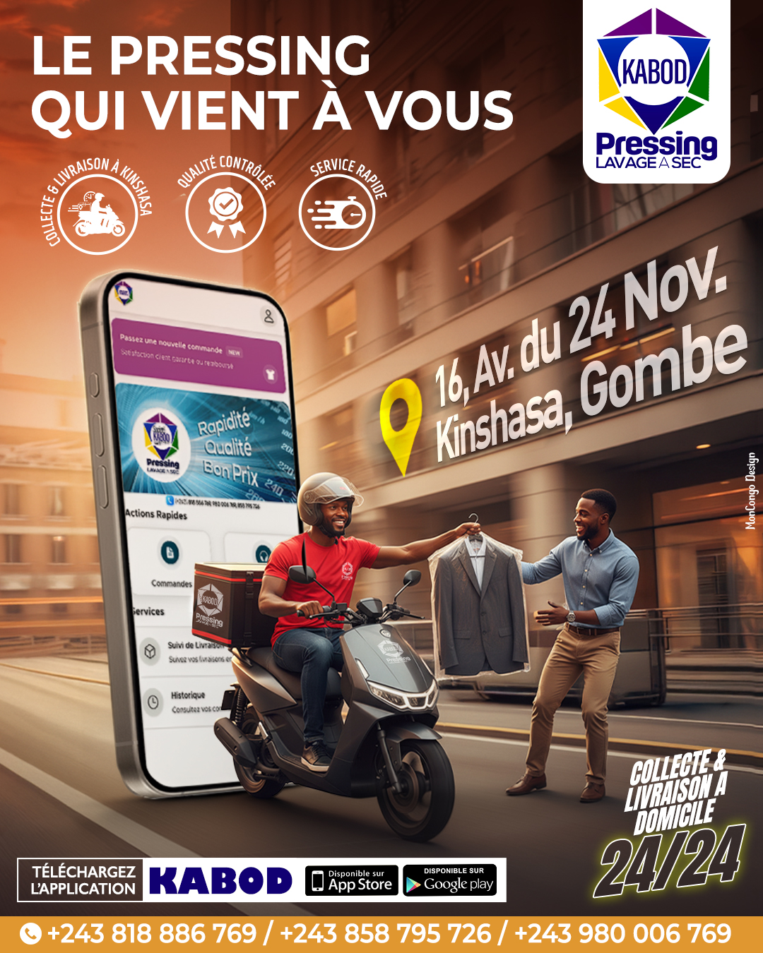 KABOD PRESSING est une société qui œvre dans la blanchisserie et utilise une application mobile pour la collecte et la livraison partout dans la ville de Kinshasa gratuitement!