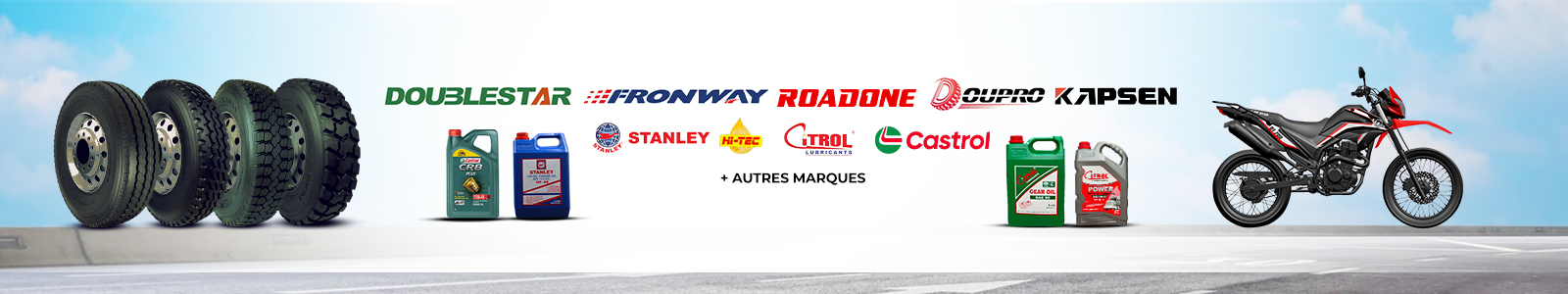 Distributeur des marques renommées telles que: Doublestar, Fronway, Roadone, Doupro, Kapsen, Stanley, Hi-Tec, Citrol, Castrol, entre autres et s'engage à fournir des solutions de mobilité de qualité supérieure.