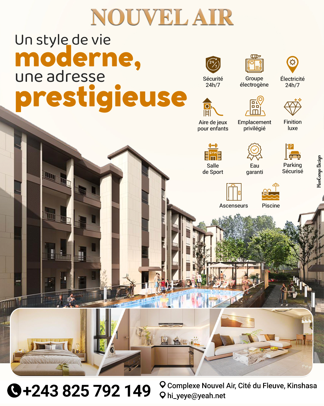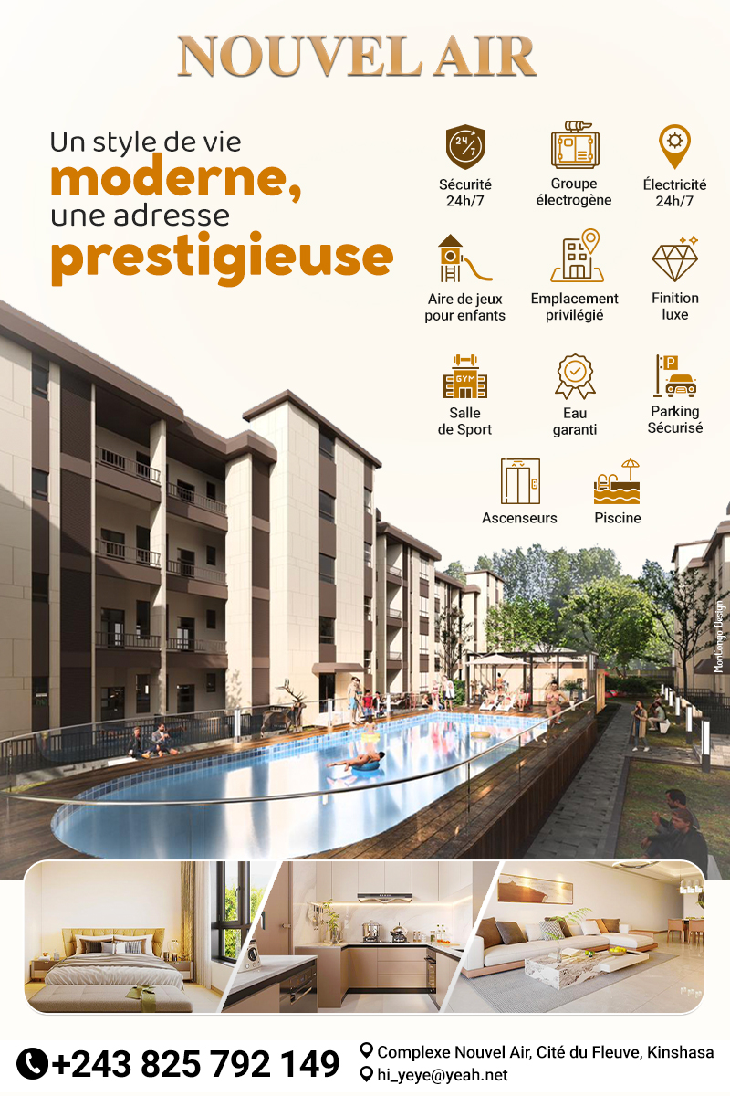 Face au majestueux fleuve Congo, NOUVEL AIR redéfinit le luxe urbain dans la capitale. Nichée au cœur du centre-ville de Kinshasa, cette résidence prestigieuse offre une harmonie parfaite entre élégance contemporaine, finitions haut de gamme et un emplacement exceptionnel.