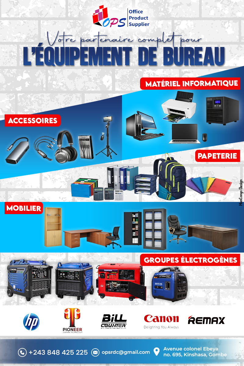 Que vous recherchiez un magasin de fournitures de bureau à Kinshasa, un fournisseur d’ordinateurs en RDC, ou un distributeur de générateurs électriques à Kinshasa, OPS est votre partenaire de confiance.