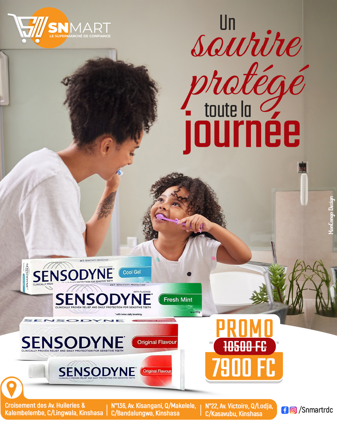 Choisissez Sensodyne à seulement 7900 CDF, au lieu de 10500 CDF.
